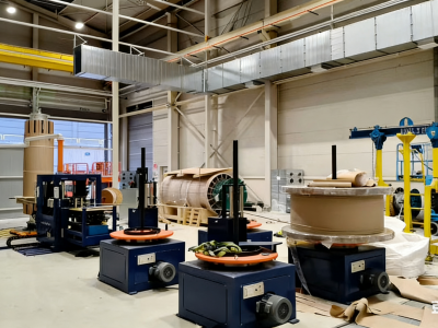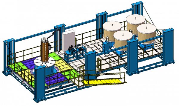 Станок для вертикальной намотки катушек силовых трансформаторов большой мощности (нагрузка 10-40 Т) оснащен усовершенствованной системой натяжения, способной обеспечить постоянное и точно регулируемое натяжение проводника на протяжении всего процесса намотки.